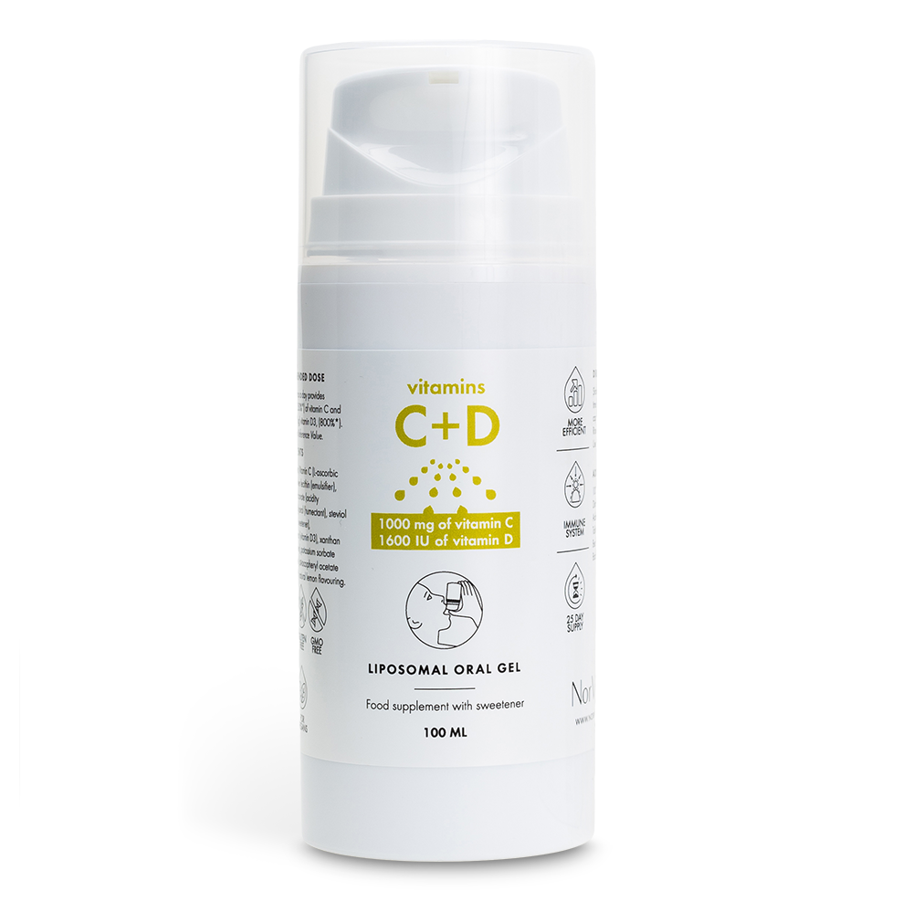 NorVita Liposomal Vitamins C+D – skystos formos geriamas vitaminas C ir vitaminas D3 liposomose, patogiame beoriame buteliuke. Tai purškiamas maisto papildas vaikams nuo 3 metų ir suaugusiesiems, leidžiantis lengvai vartoti produktą ir tiksliai dozuoti paros normą.
